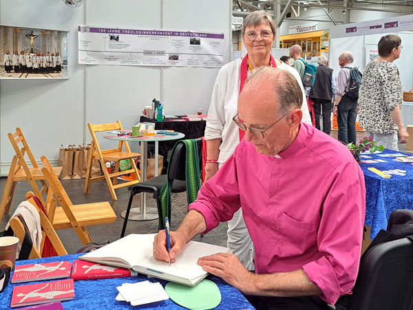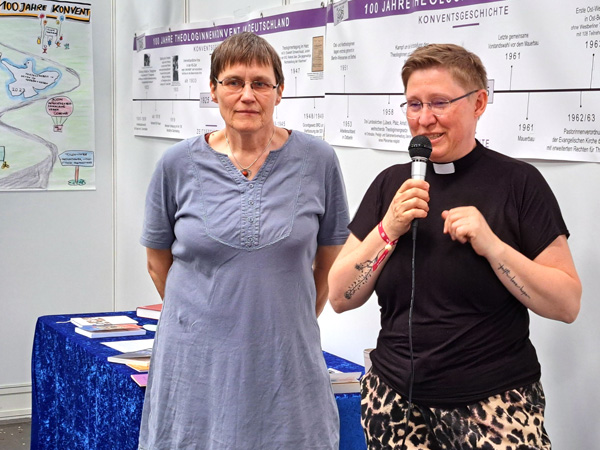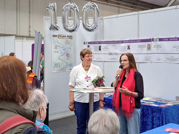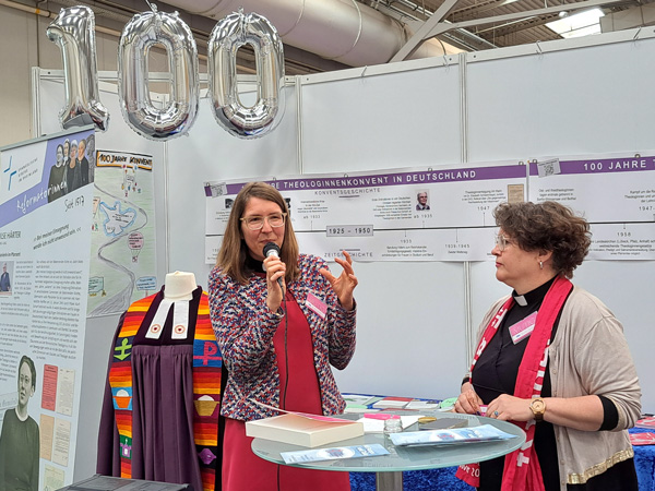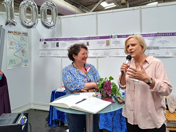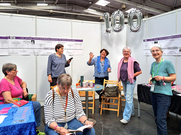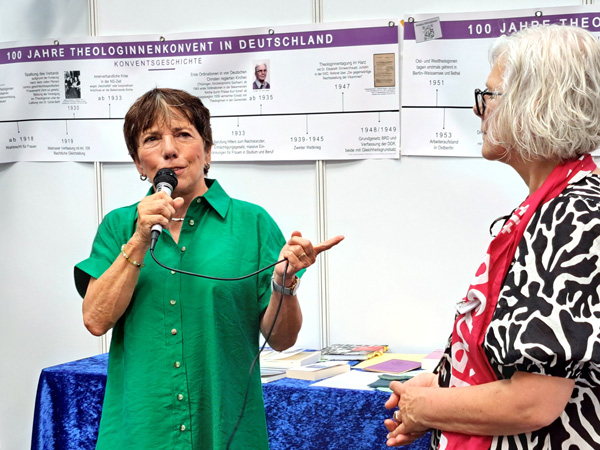Ein Anliegen unseres Konventes ist, das Gespräch über theologische Fragen der Gegenwart zu fördern und zu einer theologisch verantworteten Reform kirchlicher Arbeit und unserer Gesellschaft beizutragen. Darüber hinaus dient der Verein der Förderung und Durchsetzung der beruflichen Aufgaben der ausgebildeten Theologinnen in der Bundesrepublik. Das wollen wir kommunizieren und mit Besuchern darüber ins Gespräch kommen. Die Gemeindepraxis wird ebenfalls vorgestellt. Das ist, so denke ich, an unserem Stand durch tatkräftige Mithilfe von Kolleginnen aus allen Regionen Deutschlands gelungen.