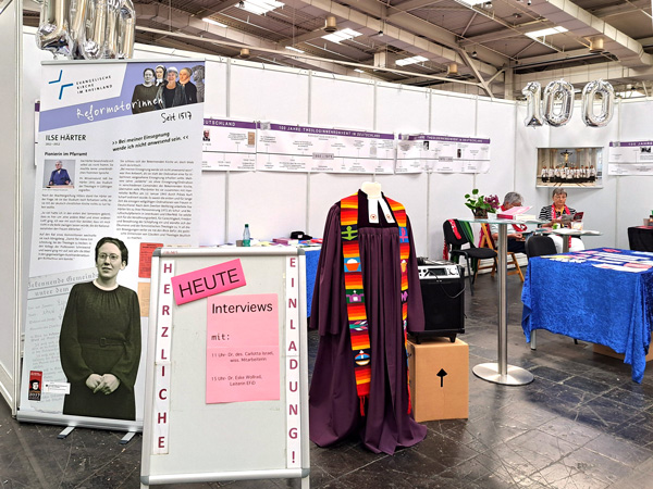 Der Konvent evangelischer Theologinnen war beim Deutschen Evangelischen Kirchentag vom 24. bis 27. Mai zum 7. Mal auf dem Markt der Möglichkeiten mit einem Stand vertreten. Schon von weitem fiel der Talar mit Beffchen und farbiger Stola auf. Wir hatten ihn auf einem Gestell so platziert, dass er als Vordergrund für ein Foto dienen konnte. Auch die Standgestaltung mit großformatigen Fotos von Frauen aus anderen Ländern in ihrer Amtstracht zog nicht nur die Blicke an, sie waren auch Anlass für Gespräche zur Frauenordination in unserem und in anderen Ländern der Welt.