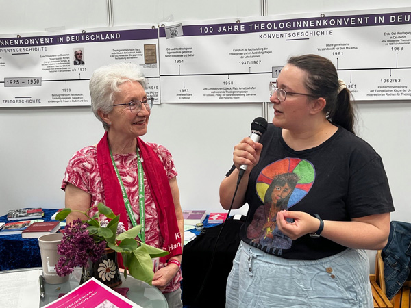 100 Jahre Theologinnenkonvent in Deutschland auf dem Kirchentag in Hannover. Die Zeitleiste zur Konventsgeschichte, der lila Talar mit bunter Stola und Lutherrosenbeffchen gaben reichlich Anlass zum Gespräch mit den Besucherinnen und Besuchern. Ilse Härter, die 1943 gemeinsam mit Hannelotte Reiffen von Präses Kurt Scharf 1943 ins Pfarramt ordiniert wurde, weckte als Standfigur die Neugier der Menschen. Visitenkarten mit Mut-machenden Worten von Tina Willms gab es zum Mitnehmen. Interviews mit starken, mutigen, beherzten Frauen fanden an den drei Tagen statt.